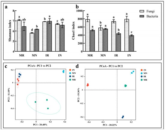 The Shannon and Chao1 indices of bacteria and fungi for each soil sample are shown in Figure 2a,b. The α-diversity results within the two treatment groups revealed that both fungal and bacterial communities in the inter-root soil exhibited higher Shannon indices than those in the inter-row soil, this suggests that soil microbial diversity is richer among ginseng roots, which may be caused by the recruitment of microorganisms by the metabolic activities of the ginseng root system. Notably, the Shannon indices of the fungal communities demonstrated significant changes, whereas those of the bacterial communities exhibited non-significant changes (Figure 2a). This may be due to the fact that fungi are able to better utilize the secreted substances of the monocropped ginseng root system and are in an advantageous position in colonization and competition. The Chao1 indices of the fungal community were found to be significantly higher than those of the inter-row soil in the monoculture inter-root soil, whereas those of the bacterial community were observed to be lower, although the difference was not found to be significant. The Chao1 indices of fungal communities were observed to be lower than those of IN soils, whereas those of bacterial communities were found to be significantly higher in IR soils (Figure 2b). A comparative analysis of the α-diversity results between the two treatment groups revealed that the Shannon index of the fungal community in the MR soil exhibited a significantly higher value than that observed in the IR soil. Conversely, the Shannon index of the bacterial community demonstrated a lower value in the MR soil than in the IR soil. The Chao1 index of the fungal community in the MR soil was found to be higher than that of the IR soil, although the difference was not statistically significant. In contrast, the Chao1 index of the bacterial community was observed to be significantly higher than that of the MR soil. The findings indicate that the intercropping treatment of ginseng and A. amurense can effectively enhance the diversity of ginseng inter-root microbial communities.