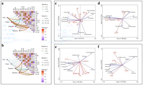 Network plots of the α-diversity indices of bacteria (a) and fungi (b) against environmental factors and Pearson’s correlation heatmap between environmental factors. Line color indicates the significance level and line thickness indicates the size of the correlation coefficient. (c,d) indicate redundancy analysis between dominant bacterial genera and soil nutrients and enzyme activities. (e,f) indicate the redundancy analysis between dominant fungal genera and soil nutrients and enzyme activities. The blue arrows in the figure represent microorganisms at the genus level and the red arrows represent soil elements and soil enzymes.