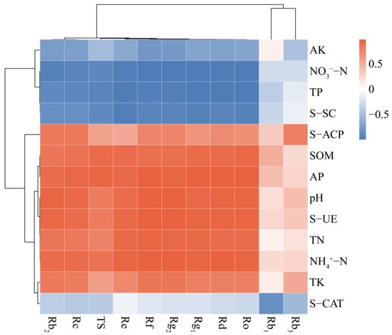 Heat map of Pearson’s correlation between soil pH, nutrients, enzyme activities and ginsenosides content.