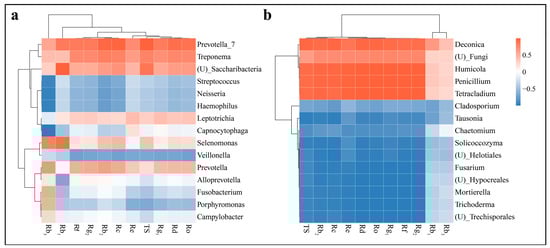 Heat map of Pearson’s correlation between the relative abundance of soil bacteria (a) and fungi (b) at the genus level and ginsenosides content.