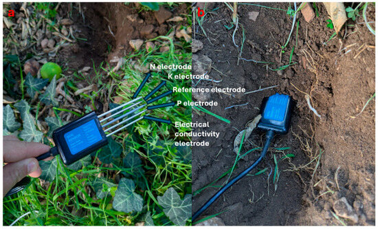 NPK probe electrodes (a) and probe insertion into the soil (b).