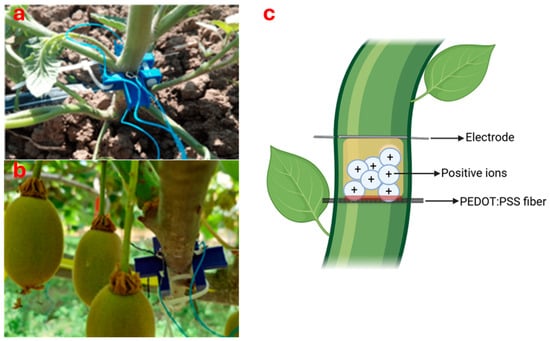 Bioristor sensor developed by Coppedè et al. [122] on a tomato plant (a) [130] and on a kiwifruit vine (b) [131] with an illustration of its operating mechanism (c).