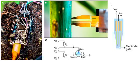 OECT biosensor developed by Diacci et al. [133]. The figure shows the Arduino measurement unit (A), the biosensor installed into the tree stem (B), the Arduino unit circuit (C) and an illustration indicating the biosensor voltage source–drain (VSD) and voltage source–gate (VSG) (D).