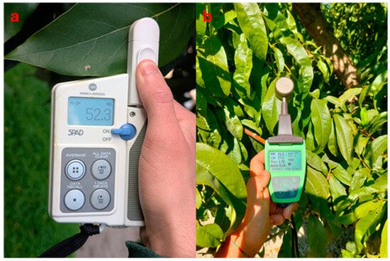 SPAD taking measurements on an avocado (Persea americana Mill.) leaf (a) and DUALEX taking measurements on a peach (Prunus persica L.) leaf (b).