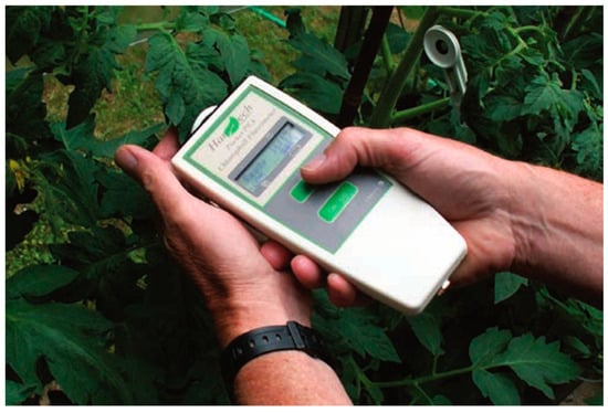 A Pocket PEA sensor measuring chlorophyll fluorescence parameters on a tomato leaf (https://www.hansatech-instruments.com/product/pocket-pea/, accessed on 5 January 2025).