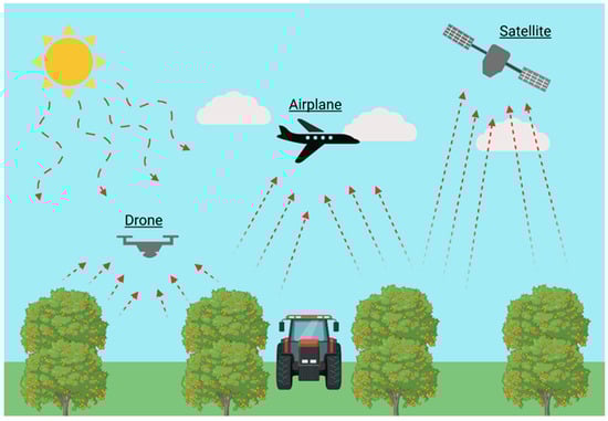 In recent years, researchers have successfully developed a variety of real-time plant-based sensors and measurement systems, such as electrochemistry [61,62,63] and optical remote sensing [64,65] to monitor nutrients and metabolites in living cells. On-tree nutrition sensors are unique devices that monitor and analyze nutrient levels in real-time in trees without interfering with their physiology to optimize their growth and development [66]. These sensors serve as tools for sustainable and precision horticulture, promoting efficient resource utilization and responsible environmental management in modern farming practices [67,68,69]. They are critical in precision horticulture because they provide real-time data on plant nutrient status, enabling targeted and efficient interventions to optimize plant health and productivity [70,71,72]. Conversely, remote sensing technologies offer a broader perspective by capturing images of entire fields, utilizing a range of optical sensors (such as multispectral and hyperspectral) to analyze spatial variability in tree and soil health, nutrient levels, and water status [73]. Thus, a combination of proximal (temporal scale) and remote (spatial scale) sensing can enhance the accuracy of information [74]. Nowadays, machine learning models and deep learning are highly useful and efficient for developing systems that can provide information and perform real-time applications. For example, these technologies have been developed to carry out real-time foliar fertilization on individual plants using unmanned aerial vehicles (UAVs) [75].