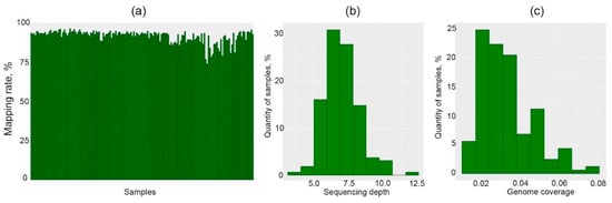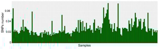 - Li, H.; Handsaker, B.; Wysoker, A.; Fennell, T.; Ruan, J.; Homer, N.; Marth, G.; Abecasis, G.; Durbin, R. The Sequence alignment/map (SAM) format and SAMtools 1000 Genome Project Data Processing Subgroup. Bioinformatics 2009, 25, 2078–2079. [Google Scholar] [CrossRef]