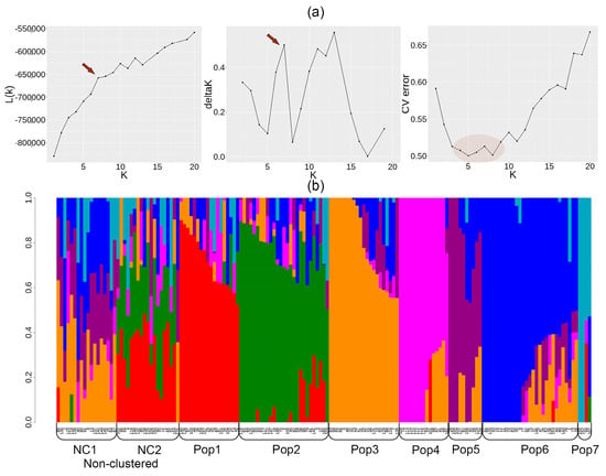 - Alexander, D.H.; Novembre, J.; Lange, K. Fast model-based estimation of ancestry in unrelated individuals. Genome Res. 2009, 19, 1655–1664. [Google Scholar] [CrossRef]