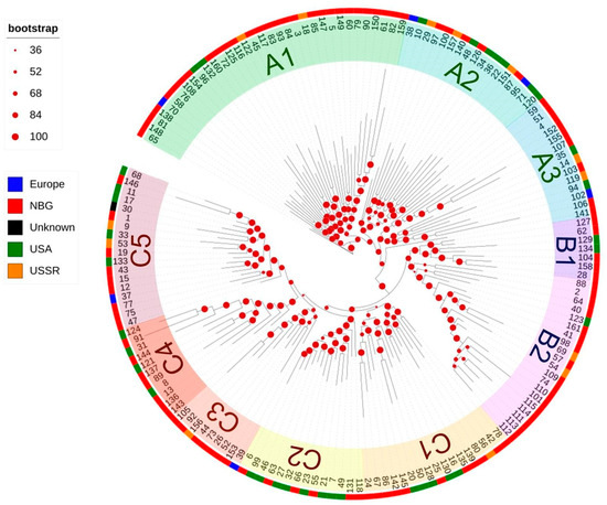 Chicago/Turabian StyleVodiasova, Ekaterina, Artem Pronozin, Irina Rozanova, Valentina Tsiupka, Gennady Vasiliev, Yuri Plugatar, Sergey Dolgov, and Anatoly Smykov. 2025. "Genetic Diversity and Population Structure of Prunus persica Cultivars Revealed by Genotyping-by-Sequencing (GBS)" Horticulturae 11, no. 2: 189. https://doi.org/10.3390/horticulturae11020189