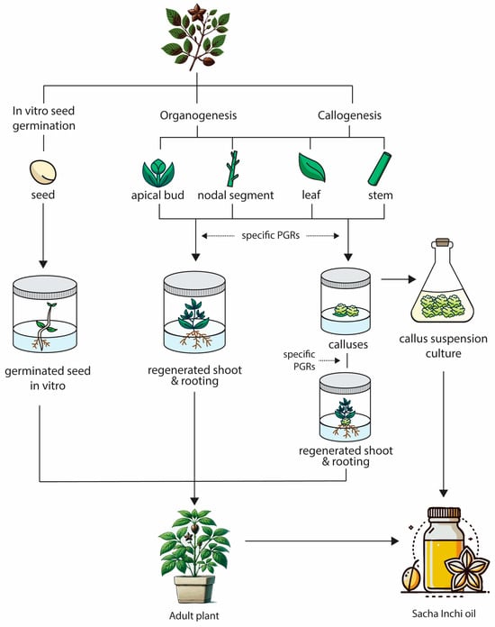 The objective of this review paper is to explore the potential of in vitro propagation techniques as a transformative approach to enhance the quality and productivity of sacha inchi for high-quality oil production and its application as a functional superfood. By delving into key methodologies, including in vitro seed germination, organogenesis from meristematic tissues such as apical buds and nodal segments, and callogenesis derived from leaves and stems (Figure 1), this paper aims to provide a comprehensive understanding of how these advanced propagation techniques can optimize the cultivation and genetic stability of sacha inchi. This information will contribute to establishing efficient strategies to meet the growing demand for its nutritionally rich oil and other health-promoting derivatives.