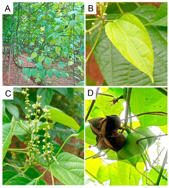 Sacha inchi is a perennial vine characterized by distinctive features (Figure 2A). Its leaves are triangular to ovate, with palmate veins and basal glands (Figure 2B). The plant bears racemose inflorescences, featuring a few pistillate (female) flowers at the base and numerous small staminate (male) flowers above (Figure 2C). The fruit develops from a four-carpelled ovary (sometimes five or six in cultivation), transitioning from green and fleshy to brown, woody, and eventually dehiscent (splitting open) (Figure 2D). The seeds are lenticular, measuring roughly 1.8 × 0.8 × 1.6 cm, with a hard, brown testa marked with darker brown [15,16,17]. This hard seed coat, along with the relatively large size of the fruit, likely contributes to the prolonged germination process. The robust seed coat may physically restrict embryo expansion, while the fruit size could influence the availability of resources and environmental conditions necessary for successful germination [18,19].
