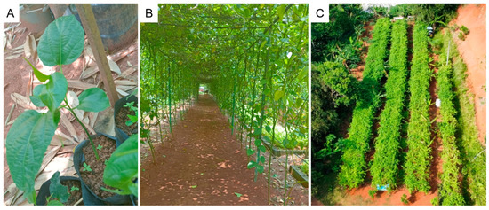 Sacha inchi plantation owned by village farmers in Ciamis, West Java, Indonesia. (A) Three-month-old sacha inchi plant. (B) A tunnel overgrown with sacha inchi plants. (C) Top view of a sacha inchi plantation.