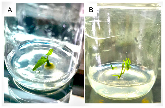 Shoots from the apical segment were cultured at 25 °C ± 2 °C under a 16/8 h photoperiod, utilizing half-strength MS medium with a pH of 5.8. The medium was supplemented with 0.5 mg/L IBA. Half-strength MS medium is commonly used for rooting because its reduced nutrient concentration minimizes inhibitory effects on root development, balances osmotic pressure, and reduces the risk of nutrient toxicity. It enhances the effectiveness of rooting hormones like IBA, promotes better root morphology with longer roots and more branching, and works effectively in various plant species. Additionally, it is cost-effective and creates a favorable environment for root initiation and elongation, making it a standard choice in tissue culture [69,70].