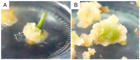 The choice of explant influences the success of shoot multiplication (Figure 5). Hypocotyls, derived from sterile explants, are effective for both shoot proliferation and callus induction, with 74% of explants forming calluses when treated with TDZ and zeatin [6]. Shoot tips (Figure 5A) and apical segments (Figure 5B) exhibited higher shoot proliferation rates, with apical buds achieving up to 2.25 shoots per explant under the optimal conditions [4]. Shoot tip explants also benefit from cytokinin-rich treatments and supplements like coconut water for enhanced shoot elongation [51].