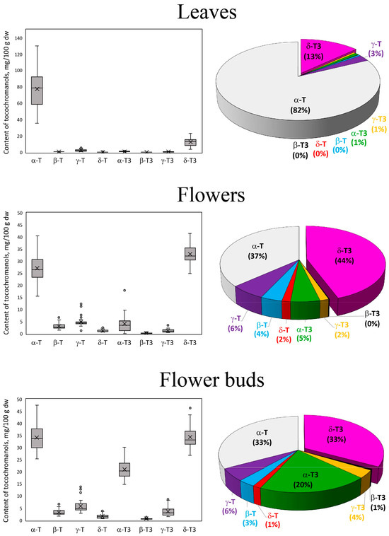 The box-plot of the content (mg/100 g dw) and average content proportion (%) of tocotrienol (T3) and tocopherol (T) homologues (α, β, γ, and δ) in leaves, flower buds, and flowers of wild H. perforatum populations in Latvia from 2022 to 2024.