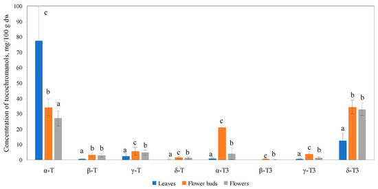 Analysis of variance for tocochromanol contents (mg/100 g dw) in three aerial parts (leaves, flower buds, and flowers) of wild H. perforatum harvested in 2022–2024 at three different locations (Salaspils, Rēzekne, Dobele) in Latvia. Values are expressed as the mean ± standard deviation (n = 54). Different letters within the same tocochromanol indicate statistically significant differences at p < 0.05. T, tocopherol; T3, tocotrienol; dw, dry weight.