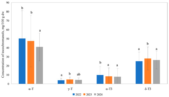 The year of harvest had a statistically significant effect (p < 0.05) on the content of four tocochromanols recorded at the highest concentrations in St. John’s wort, namely α-T ≥ δ-T3 > α-T3 > γ-T. Noteworthy is the observation of the highest concentration for α-T in 2022 and the lowest in 2024 (20% decrease), and a relatively low effect on the remaining tocochromanols (Figure 3). This is a valuable observation from the point of view of the content stability of tocotrienols in St. John’s wort. The large inter-annual variability observed for α-T may be due to differences in stress during the study period. α-T is a lipophilic antioxidant that contributes to the protection of photosystem II against photodamage under environmental stress. It has been demonstrated that an RNAi line (vte5) with decreased expression of VTE5 and reduced levels of α-T protects against combined high-light and high-temperature stress by α-T production in tomato leaves [32].
