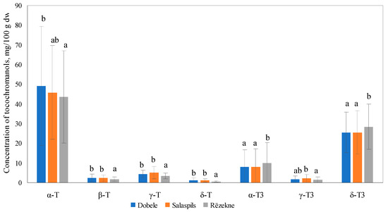 The harvest location (Figure 4) had a statistically significant effect (p < 0.05) on the content of all tocochromanols, except for β-T3, characterized by the lowest concentrations in H. perforatum. Tocochromanols content in St. John’s wort collected in the locations Dobele and Salaspils, localities 80 km apart, showed no statistically significant difference, while the difference between these two locations and Rēzekne was statistically significant (p < 0.05) for most of the tocochromanols. The observation of the highest concentration of tocopherols in H. perforatum collected in Dobele and Salaspils is noteworthy, while a higher tocotrienols content was noted in plants collected in Rēzekne. The differences between Dobele–Rēzekne (300 km) and Salaspils–Rēzekne (220 km) were distinct between the different localisations. According to the meteorological data, Rēzekne is characterized by lower temperatures during the year compared to Dobele and Salaspils. In general, there is no clear answer related to the effect of temperature on the accumulation of tocopherols in various plant tissues (seeds or leaves). Moreover, it may be more related to sun radiation than temperature [33]. There are no reports surrounding the case of tocotrienol accumulation in plant tissue under different temperature influences. In addition, factors such as soil type and genotype were not examined in the present study, while the genotype of the cultivated St. John’s wort plants was found to be a key factor in the concentration of hydrophilic secondary metabolites [19].