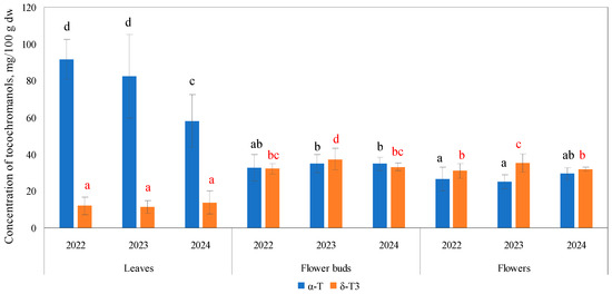 Interaction effects of plant part and year on tocochromanol contents (mg/100 g dw) in three aerial parts (leaves, flower buds, and flowers) of wild H. perforatum harvested in 2022–2024 at three different locations (Salaspils, Rēzekne, Dobele) in Latvia. Values are expressed as the mean ± standard deviation (n = 18). Different letters (red for δ-T3 and black for α-T) within the same tocochromanol indicate statistically significant differences at p < 0.05. T, tocopherol; T3, tocotrienol; dw, dry weight.
