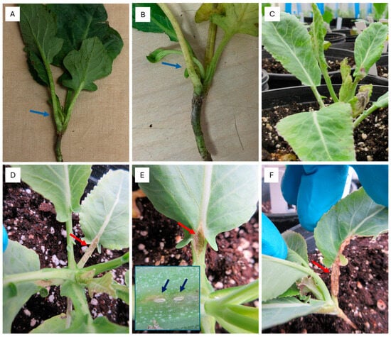 (A–C) distorted shoots (blue arrows) after adult Lygus hesperus feeding, and (D–F) lesions on the midrib of plants (red arrows). Blue arrows inside (E) show the opercular of L. hesperus eggs visible under 10× magnification of a dissecting microscope.