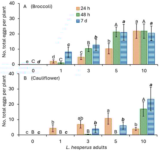 Mean (±SE) number of eggs found on plant tissues after exposing various densities of adult Lygus hesperus for various durations on (A) broccoli and (B) cauliflower seedlings. The same letters (lower, upper, and bold case) above bar types (orange, green, blue), compared among adult densities, within each figure were not significantly different (Tukey–Krammer test, p < 0.05).
