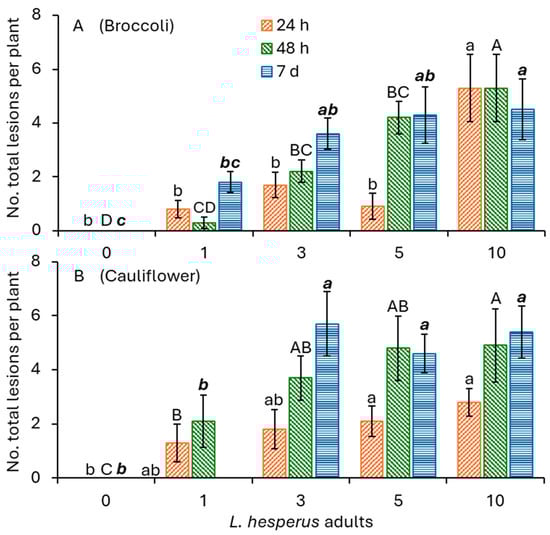After 24 h of exposure, the number of discrete lesions was significantly greater in the 10-adult treatment than in the 5-, 3-, 1-, and 0-adult treatments in broccoli (F = 13.5; df = 4, 36; p < 0.001; Figure 4A). At 48 h post-exposure, the pattern of lesion development was similar to that of the 24 h exposure, where significantly a greater number of lesions was observed in the 10-adult treatment than in the 5-, 3-, 1-, and 0-adult treatments (F = 13.4; df = 4, 36; p < 0.001). After 7 d of exposure, the number of lesions was significantly greater in the 10-adult treatment than in the 1- or 0-adult treatments (F = 8.1; df = 4, 36; p < 0.001; Figure 4A). There was no significant difference in the number of lesions between the 10-, 5-, and 3-adult treatments. Pearson’s correlation showed a significantly positive association between the total numbers of L. hesperus eggs and lesions developed (r = 0.789; N = 150; p < 0.001).