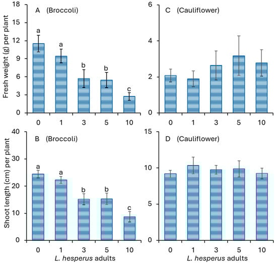 There were no differences in plant weight and length of shoots for cauliflower regardless of adult L. hesperus density, but these parameters decreased progressively with an increase in adult L. hesperus density for broccoli. Although the exact reason is unclear, it is possible that the growth rate of cauliflower was affected by the conditions provided in the current study. Growing cauliflower is challenging compared to broccoli, as it is sensitive to variations in temperature, relative humidity, and moisture conditions in the soil []. For commercial production, cauliflower seeds are planted in trays in greenhouses, and the seedlings are raised for up to six weeks before being transplanted to the field []. Perhaps this high sensitivity of cauliflower to environmental conditions influenced reduced seedling growth, and the effects of adult L. hesperus interactions were not manifested.