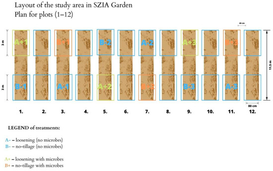As previously mentioned, the practical phase of this research was conducted at the SZIA Agroecological Garden, MATE, in Gödöllő, Hungary. In March 2024, the experimental field was organized into 12 distinct plots, each separated and randomized to prevent the cross-contamination of microbial treatments. A randomized complete block design (RCBD) was used in this study to enhance the precision of the results by accounting for environmental variation, particularly for the microbial treatment studies, as it effectively controls potential soil fertility gradients and moisture differences.