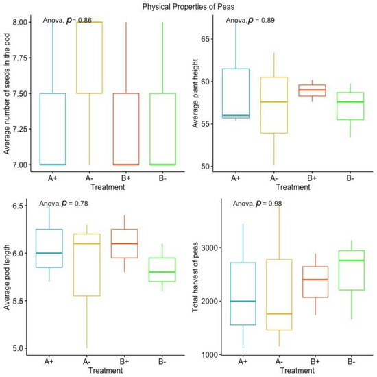 Figure 5 summarizes the chemical properties of the peas using box plots generated through one-way ANOVA in R statistical software. This analysis evaluates the p-values for the different soil properties, offering a statistical assessment of the data.