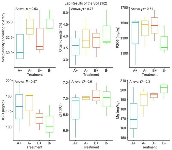 Table 5 presents comprehensive measurements from the different plots, labeled as A− (loosening without microbes), B− (no-tillage without microbes), A+ (loosening with microbes), and B+ (no-tillage with microbes). The presented parameters include soil plasticity according to Arany, organic matter (%), P2O5 (mg/kg), K2O (mg/kg), CaCO3 (m/m%), pH (KCl), and Mg (mg/kg).
