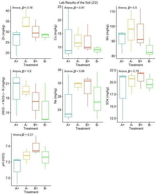 Table 6 presents comprehensive measurements from the different plots, labeled as A− (loosening without microbes), B− (no-tillage without microbes), A+ (loosening with microbes), and B+ (no-tillage with microbes). The presented parameters include Zn (mg/kg), Cu (mg/kg), Mn (mg/kg), (NO2− + NO3−) − N (mg/kg), Na (mg/kg), SO4 (mg/kg), all water-soluble salts (m/m%), and pH (H2O).