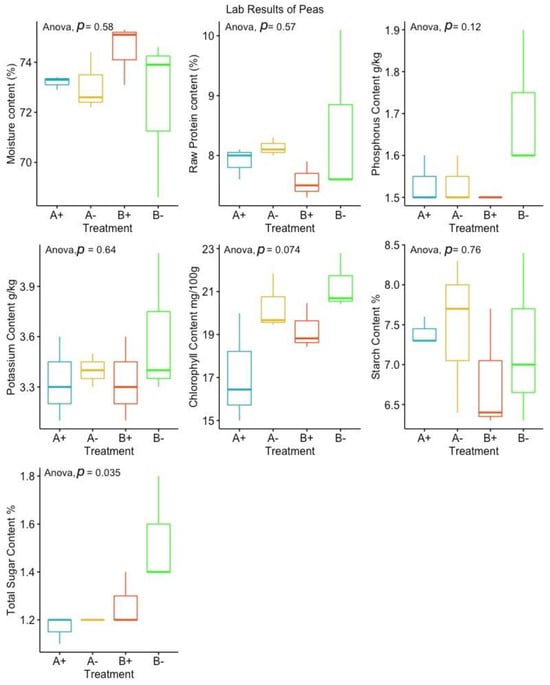 Table 7 presents comprehensive measurements from the different plots, labeled as A− (loosening without microbes), B− (no-tillage without microbes), A+ (loosening with microbes), and B+ (no-tillage with microbes). The presented parameters include the following chemical properties of the peas: moisture content %, raw protein content %, phosphorus content g/kg, potassium content g/kg, chlorophyll content mg/100 g, starch content %, and total sugar content %.