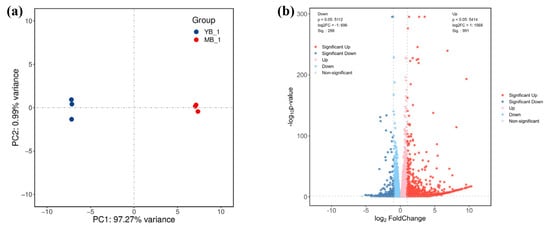 PCA (Principal Component Analysis) and volcano plot of the differentially expressed genes (DEGs). (a) PCA plot of RNA-seq. Blue points denote the YB group and red points represent the MB group. (b) Volcano plot of the gene expression profiles in YB and MB; p < 0.05, log2FC < −1 or >1. Blue points are the down-regulated genes, red points are the up-regulated genes and gray points are the non-significant genes.