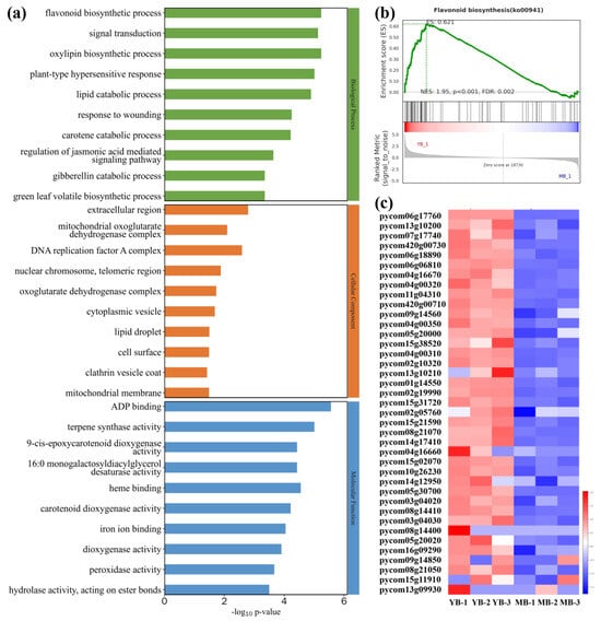 The GO enrichment analysis was employed to investigate the 991 up-regulated genes among the DEGs in the YB and MB comparison. The top ten significant terms in GO enrichment, categorized into BP (biological process), CC (cellular component) and MF (molecular function), are presented in Figure 3a. Notably, the flavonoid biosynthetic process, signal transduction and oxylipin biosynthetic process in BP; the extracellular region, mitochondrial oxoglutarate dehydrogenase complex and DNA replication factor A complex in CC; and the ADP binding, terpene synthase activity and heme binding in MF were enriched significantly. Among these, the top flavonoid biosynthetic process (GO: 0009813) of biological process was selected for further analysis with the GSEA (Gene Set Enrichment Analysis). The enrichment score (NES: 1.95, p < 0.001 and FDR: 0.002) and ranked metric results confirmed that this metabolic pathway was enriched, and many genes of this gene set increased their expression in the YB group (Figure 3b). The expression profiles of these up-regulated genes involved in flavonoid biosynthesis were visualized in a heat map (Figure 3c).