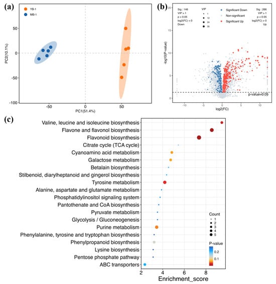 Overview of the non-targeted metabolomics and DAM analyses. (a) PCA of metabolomics. Blue and red dots represent YB and MB groups, respectively. (b) Volcano of the DAMs for YB and MB. VIP > 1, p < 0.05 and log2(FC) > 0 or log2(FC) < 0. Blue points: significant down-regulated metabolites; red points: significant up-regulated metabolites; gray points: non-significant metabolites. (c) Top 20 KEGG terms of YB vs. MB. The color of the dot represents the different p-values, and the color scale from blue to red indicates that the p-value ranges from large to small. The size of the dot displays the number of DAMs.