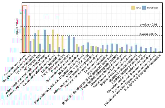 A conjoint analysis was performed to visualize the relationships between transcriptome and metabolome to identify the differences in genes and metabolic pathways between YB and MB. KEGG enrichment analysis was carried out to show the distribution patterns of the common pathways within both the transcriptome and metabolome. The result revealed that DAMs and DEGs were co-enriched in the flavonoid biosynthesis pathway (p-value < 0.05) (Figure 5). Notably, the phenylpropanoid biosynthesis pathway was enriched significantly in the transcriptome, whereas its enrichment in the metabolome was not sufficiently significant. On the contrary, the tyrosine metabolism pathway showed a significant enrichment in DAMs, but its DEGs did not display a significant enrichment. In particular, the flavonoid biosynthesis pathway displayed the most pronounced enrichment in DAMs, suggesting that this pathway may play an important role in the differences observed between YB and MB.