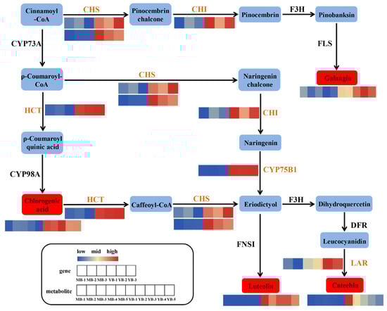 To further investigate the key genes and metabolites in flavonoid biosynthesis, we conducted a detailed analysis of the related genes and metabolites with this pathway. In comparison to MB, YB exhibited enhanced expression or anabolism of six genes encoding five crucial enzymes and four metabolites (Figure 6). Chalcone synthase (CHS), a significant and ubiquitous enzyme in plants, plays vital roles in the biosynthesis of flavonoid compounds []. Importantly, the expressions of two CHS genes (pycom420g00730 and pycom13g10200) were elevated obviously in YB compared to MB. Additionally, the gene of chalcone isomerase (CHI) (pycom07g17740) also showed increased expression in YB, facilitating the conversion of cinnamoyl-CoA to galangin, leading to increased accumulation of galangin in YB. The up-regulated expression of a gene coding for hikimate O-hydroxycinnamoyl transferase (HCT) (pycom09g14560) promoted the synthesis of chlorogenic acid. Furthermore, the up-regulation of genes encoding HCT, CHS, 5-O-(4-coumaroyl)-D-quinate 3′-monooxygenase (CYP75B1) (pycom06g17760) and leucoanthocyanidin reductase (LAR) (pycom06g18890) collectively contributed to the accumulation of luteolin and catechin. Consequently, the biosynthesis process of flavonoids was activated in YB.