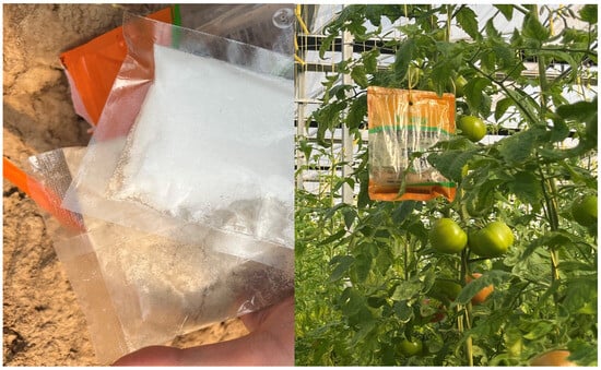 CGBs consist of two different components, namely the main material and the catalytic slow-release material, where the main material is ammonium bicarbonate, and the primary components of the catalytic slow-release material are humic acid, citric acid, and other weak acids. Prior to use, they are packaged separately in two small bags to prevent any reactions and the release of carbon dioxide. During the application process, the individual packages are opened, and the slow-release material is sprinkled into the main material and mixed evenly. The bags are then opened and hung in the greenhouse, where ammonium bicarbonate reacts with the acid to produce carbon dioxide, which is released into the greenhouse. CGBs continuously release CO2 to the plants in the greenhouse until the reactants are completely consumed. After a certain reaction time, the raw materials are depleted, and the effect of CO2 supplementation ends, leaving the remaining reaction residues in the bag. Figure 1 illustrates the usage scenarios of CGBs.