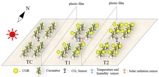 Taking the different application densities of CGBs as the test factors, three compartments were designed for the experiment: no additional application (TC), no CGBs were used for air replenishment at all; at the low-density application level (T1), 8 CGBs were hung evenly over the 265 m2 experimental area; at the high-density application level (T2), 16 CGBs were hung evenly over the 265 m2 experimental area. Each CGB was hung at a height of 1.8 m in the greenhouse. About 1500 cucumbers were used as the total number of plants designed in the greenhouse; the cucumber stubble was planted only once during the winter growing and was not replicated. The entire solar greenhouse was divided into 3 compartments for CGB application density tests. Each compartment was partitioned with plastic film. In each compartment, the number of cucumber plants was about 500. A schematic diagram of the test site is shown in Figure 2.