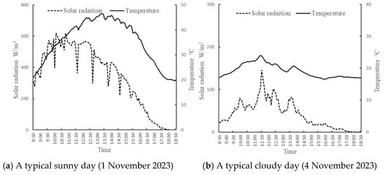 Figure 3 shows the difference in solar radiation and temperature in a greenhouse on a typical sunny and cloudy day. On a typical sunny day (1 November 2023), the light and temperature conditions in the greenhouse were ideal, with a high overall solar radiation intensity in the greenhouse, reaching a maximum of 619 W/m2. The temperature rose from around 10 a.m. to over 30 °C and lasted until around 5 p.m. On this typical sunny day, the average daytime temperature in the greenhouse reached 35 °C. In contrast, on a typical cloudy day (4 November 2023), the intensity of solar radiation in the greenhouse after sunrise was low, with a maximum value of only 145 W/m2 and a short duration. The temperature in the greenhouse did not exceed 30 °C throughout the day, and the average daytime temperature was only 19 °C.