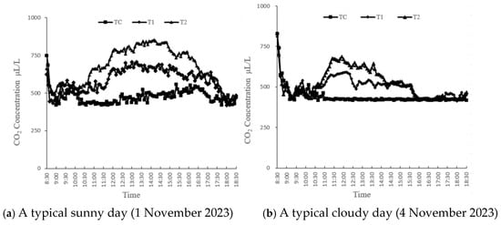 Figure 4 shows the difference in the CO2 replenishment effect of hanging CGBs in a solar greenhouse under typical sunny and cloudy conditions. On a sunny day (1 November 2023), in the morning, the CO2 concentration in the greenhouse decreased rapidly and remained at 500 μL/L. At about 11 o’clock, the CO2 concentration in the T1 and T2 test areas continued to rise, and the highest concentration in the T2 area reached 854 μL/L, whereas the highest concentration in the T1 area was 706 μL/L. The CO2 concentration in the two recharge zones was about 200–300 μL/L higher than that in the TC zone during the day. The high CO2 enrichment effect lasted for nearly 5 h, until it gradually weakened and returned to the baseline level after 17 o’clock. On a cloudy day (4 November 2023), the CO2 concentration in the greenhouse also decreased rapidly after sunup, but the difference between the CO2 concentration in the T1 and T2 areas and the TC area was smaller than that on sunny days. The highest concentration in the T2 area was only 687 μL/L, while the highest concentration in the T1 area was 591 μL/L. The CO2 concentration in the two recharge zones was only about 150–250 μL/L higher compared to the TC area during the day. Moreover, the high CO2 enrichment effect lasted only for about 3 h and began to weaken after 3 pm and gradually returned to the natural level.