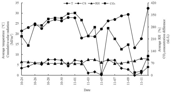 Continuous variation of environmental parameters and CO2 concentration. Note: T represents the average temperature, CS represents the cumulative solar radiation, RH represents the average RH, and CO2 represents the difference in CO2 concentration between the T2 compartment and the TC compartment.