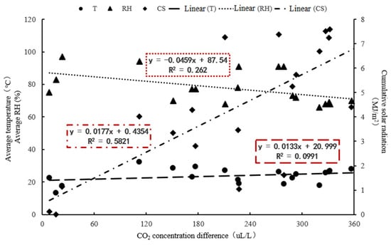 To ensure that the effect of CGB concentration in the correlation analysis is not affected by the subsequent replacement CGBs, the greenhouse environmental parameters of the first batch of CGBs (October 24 to October 31) were monitored. Linear correlation analysis was performed on the average greenhouse temperature, average RH, cumulative solar radiation, and the difference in CO2 concentration between the T2 area and TC area from 10 a.m. to 2 p.m. during the day.