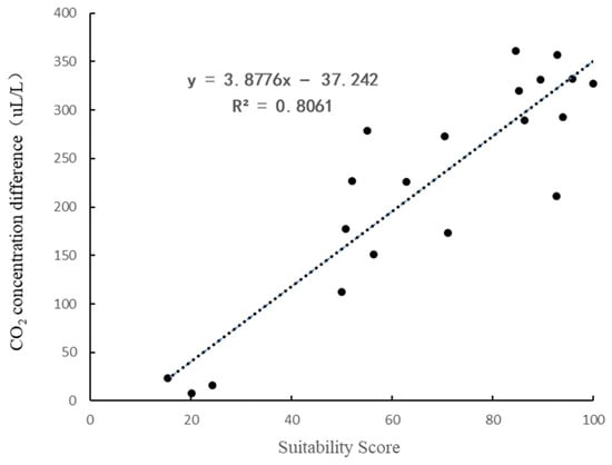 The data in Figure 7 show that the correlation coefficient between the environmental suitability score and the difference in CO2 concentration is much higher than that between single environmental parameters and the difference in CO2 concentration. This finding indicates that the comprehensive suitability score of environmental factors can reflect the effect of CGBs to a certain extent compared with the evaluation of a single environmental parameter. Maintaining a high overall environmental score in the greenhouse and replacing CGBs regularly and reasonably are key factors in ensuring the effectiveness of the CGBs.