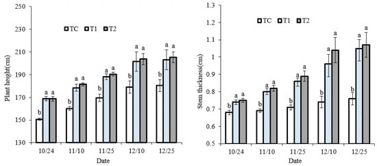 Changes in plant height and stem thickness in cucumber CGB test. TC—no application, T1—8 bags/265 m2, and T2—16 bags/265 m2. Note: According to Duncan’s multiple range test, different letters indicate significant differences at p < 0.05.