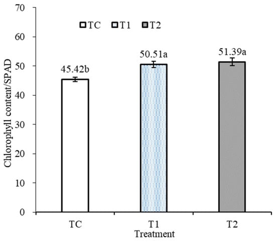 Histogram of chlorophyll content in cucumber. Note: According to Duncan’s multiple range test, different letters indicate significant differences at p < 0.05. No application (TC), 8 bags/265 m2 (T1), and 16 bags/265 m2 (T2).