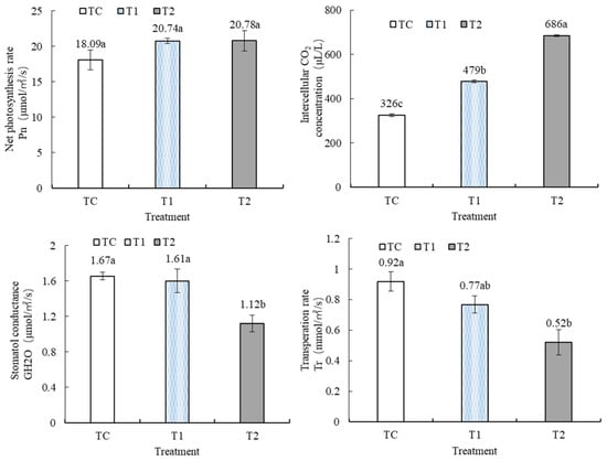 In Figure 10, the net photosynthetic rate of T1 and T2 treatments was slightly higher than that of TC, but the difference was not significant, and the net photosynthetic rate was 2.65 and 2.69 μmol/(m2·s) higher than that of the TC group, respectively. However, significant differences in the intercellular CO2 concentrations were found among the treatment groups. The T1 and T2 concentrations of the supplemental treatment were significantly higher than those of TC, with intercellular CO2 concentrations of 326, 479, and 686 μL/L, respectively. The stomatal conductance of T2 was significantly lower than that of TC and T1 among different treatments, and the stomatal conductance level of T2 was only 1.12 μmol/(m2·s). However, no significant difference in the stomatal conductance level was observed between T1 and TC. Additionally, the transpiration rate of TC was higher than that of T1 and T2. The transpiration rate of T2 was the lowest, only 0.52 mmol/(m2·s). According to the analysis of various parameters, the net photosynthetic rate and intercellular CO2 concentration in the T1 and T2 areas were higher than those of the TC group. Furthermore, the stomatal conductance and transpiration rate were reduced by the gas supplementation treatment.