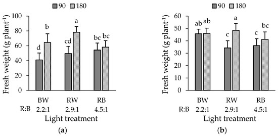 Fresh weight of (a) green ‘Bartimer’ and (b) purple ‘Soltero’ lettuces grown hydroponically in a vertical farm exposed to different light spectra and PAR intensities (µmol m−2 s−1) at 45 days post-transplanting. Different letters indicate significant differences in the factor or the interaction between factors (Fisher’s test, p ≤ 0.05).