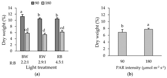 Dry weight percentage of (a) green ‘Bartimer’ and (b) purple ‘Soltero’ lettuces grown hydroponically in a vertical farm exposed to different light spectra and PAR intensities (µmol m−2 s−1) at 45 days post-transplanting. Different letters indicate significant differences in the factor or the interaction between factors (Fisher’s test, p ≤ 0.05).