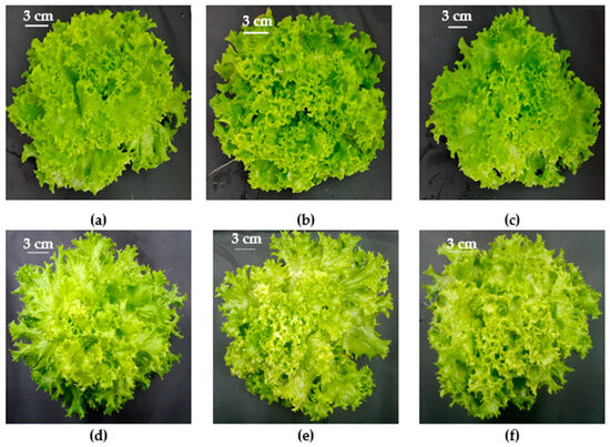 Green ‘Bartimer’ lettuce grown hydroponically in a vertical farm exposed to (a) BW-90 µmol m−2 s−1; (b) RW-90 µmol m−2 s−1; (c) RB-90 µmol m−2 s−1; (d) BW-180 µmol m−2 s−1; (e) RW-180 µmol m−2 s−1; (f) RB-180 µmol m−2 s−1 at 45 days post-transplanting.